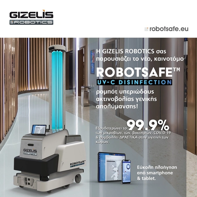 Ο κ. Ευάγγελος Γκιζελής, ιδρυτής και Διευθύνων Σύμβουλος της Gizelils Robotics τονίζει: «Είμαστε πολύ υπερήφανοι για την οικογένεια “made in Greece” προϊόντων υψηλής ρομποτικής τεχνολογίας ROBOTSAFE™ που έχουμε αναπτύξει. Με τα ρομπότ τεχνολογίας εκνέφωσης και τώρα με UV-C υπεριώδη ακτινοβολία, προσφέρουμε ολοκληρωμένες state-of-the-art λύσεις, που συμβάλουν δραστικά στην αποτελεσματική απολύμανση και υγιεινή όλων των χώρων εργασίας. Το νέο καινοτόμο ρομπότ υπεριώδους τεχνολογίας που σήμερα τοποθετούμε στην ελληνική και διεθνή αγορά ανταποκρίνεται αποτελεσματικά στις σύγχρονες υγειονομικές προκλήσεις της εποχής μας».
