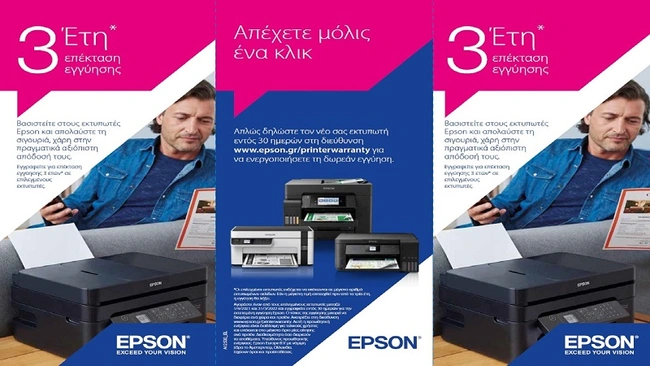 Η Epson, πρωτοπόρος εταιρεία σε προϊόντα εκτύπωσης και οπτικής απεικόνισης, προχώρησε σε ανανέωση του προγράμματος επέκτασης εγγύησης[1] για 3 έτη με αγορές επιλεγμένων προϊόντων.