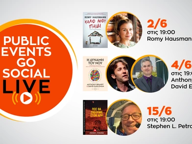Ο Ιούνιος φέρνει μαζί του σημαντικούς συγγραφείς διεθνούς κύρους, οι οποίοι θα μιλήσουν για τα βιβλία τους αποκλειστικά μέσω του #PublicEventsGoSocial που συνεχίζεται με αμείωτους ρυθμούς! Το Public, το #1 βιβλιοπωλείο της χώρας έχει την τιμή να υποδεχθεί τον Ιούνιο σε ζωντανή σύνδεση προσωπικότητες όπως η Romy Hausmann, ο David Eagleman και ο Stephen Petranek, μέσα από τη σελίδα του Public στο Facebook και το κανάλι του Public στο YouTube.
