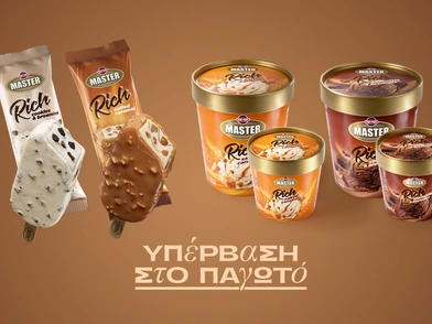 H επανάσταση ξεκινάει με τα ξυλάκια Master Rich Salted Caramel και Master Rich Cookies & Brownies. Σε κάθε δάγκωμα, τα νέα Master Rich με τα μεγάλα λαχταριστά κομμάτια, τόσο στην επικάλυψη όσο και στο εσωτερικό του παγωτού, αποτελούν μια ωδή στην υπερβολή, στην απόλαυση χωρίς όρια.