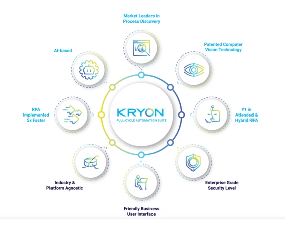Εφοδιασμένη με την άριστη και κατοχυρωμένη AI τεχνολογία της, η εταιρεία παράγει το μοναδικό στο είδος του εργαλείο χαρτογράφησης διαδικασιών, το Kryon Process Discovery, το οποίο διευκολύνει την οπτικοποίηση των επιχειρησιακών διαδικασιών χρησιμοποιώντας πρωτοποριακούς αλγόριθμους. Με αυτήν την τεχνολογία είναι σε θέση να αντιλαμβάνεται τις διαφορετικές και επαναλαμβανόμενες εταιρικές δραστηριότητες, να τις αξιολογεί και να προτείνει εύστοχες λύσεις ως προς την αυτοματοποίησή τους. Αυτή η ολοκληρωτική λύση μεγιστοποιεί την απόδοση και μειώνει τον χρόνο υλοποίησης έως και 80%. Αυτό κάνει την Kryon να ξεχωρίζει και είναι το μυστικό που διασφαλίζει ότι κάθε διαδικασία αυτοματισμού είναι επιτυχημένη από την αρχή ως το τέλος.