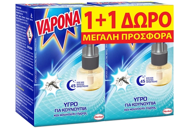 To προϊόν «πρωταγωνιστής» για την προστασία από τα κουνούπια είναι η ηλεκτρική συσκευή Vapona με ρυθμιστή έντασης και 5 σε 1 οφέλη, η οποία σε συνδυασμό με τα Vapona εντομοαπωθητικά σώματος παρέχουν πλήρη και αποτελεσματική προστασία μέσα και έξω από το σπίτι!