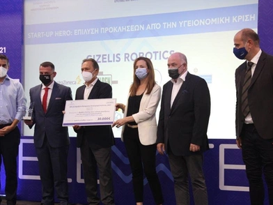 Συγκεκριμένα, η εταιρεία «Gizelis Robotics» βραβεύτηκε στην κατηγορία «Startup Ηero: επίλυση προκλήσεων από την υγειονομική κρίση Covid-19». Η εταιρεία δημιούργησε το Robotsafe™, το πρώτο Made in Greece αυτόνομο ελληνικό ρομπότ απολύμανσης, με τεχνολογία εκνέφωσης και με τεχνολογία UV-C. Το Robotsafe™ έχει κατασκευαστεί για εταιρικούς χώρους, εγκαταστάσεις, βιομηχανίες, αποθήκες, εργοστάσια, ξενοδοχεία, κέντρα διανομής, αεροδρόμια και υγειονομικούς χώρους. Το βραβείο απένειμε στον κ. Ευάγγελο Γκιζελή Ιδρυτή και Διευθύνοντα Σύμβουλο της εταιρείας, ο υφυπουργός Ανάπτυξης και Επενδύσεων κ. Χρίστος Δήμας.