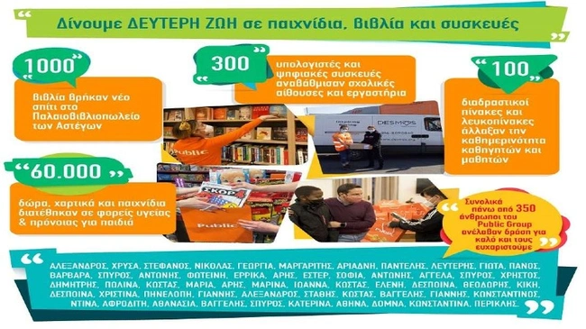 Με μια σειρά από κοινωνικές πρωτοβουλίες και εθελοντικές δράσεις, οι άνθρωποι του Public Group συνέβαλαν στο έργο κοινωνικών φορέων ανά την Ελλάδα σε τομείς όπως η ψηφιακή εκπαίδευση, η κοινωνική ενσωμάτωση και η κοινωνική μέριμνα, δίνοντας επιπλέον αξία σε χιλιάδες παιχνίδια, βιβλία και προϊόντα τεχνολογίας από τη γκάμα τους. Συγκεκριμένα, το προηγούμενο διάστημα, το Public Group με τη στήριξη των εργαζομένων του σε κεντρικά και καταστήματα: