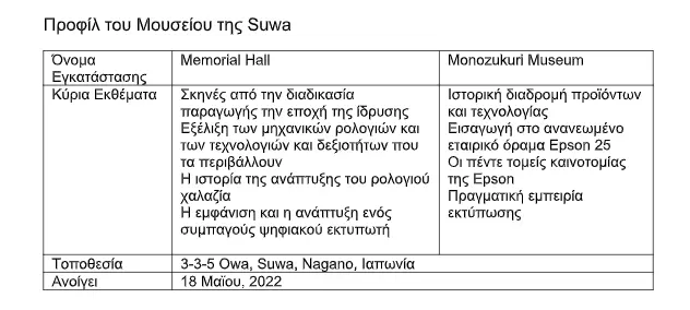Η Epson, με αφορμή τον εορτασμό των 80 χρόνων λειτουργίας της, πρόκειται να ανοίξει το Μουσείο Epson Suwa στα κεντρικά γραφεία της εταιρείας στη Σούβα του Ναγκάνο, στην Ιαπωνία. Το μουσείο δύο τμημάτων, το οποίο αποτελείται από ένα ανακαινισμένο Μουσείο Monozukuri και ένα νέο Memorial Hall, θα δώσει στους επισκέπτες την ευκαιρία να μάθουν για την ιστορία και τα προϊόντα της Epson από το παρελθόν. Το Memorial Hall στεγάζεται στο κτίριο όπου ήταν το αρχικό διοικητήριο, η κατασκευή του οποίου ολοκληρώθηκε τον Οκτώβριο του 1945. Αυτό το πρόσφατα ανακαινισμένο ιστορικό κτήριο θα είναι ανοιχτό για το κοινό από σήμερα.