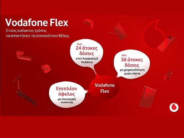 Η Vodafone φέρνει το Vodafone Flex, την νέα ευέλικτη και ελκυστική οικονομική πρόταση στην Ελληνική αγορά, που προσφέρει μέσα από τα καταστήματα Vodafone σε νοικοκυριά και μικρές επιχειρήσεις την απόλυτη ευελιξία στην αγορά συσκευών τεχνολογίας, στα μέτρα του πελάτη. Πρώτη η Vodafone στην ελληνική αγορά προσφέρει τη δυνατότητα για άτοκες δόσεις μέσω του Vodafone μηνιαίου λογαριασμού ή τραπεζικής χρηματοδότησης ή και πιστωτικής κάρτας.