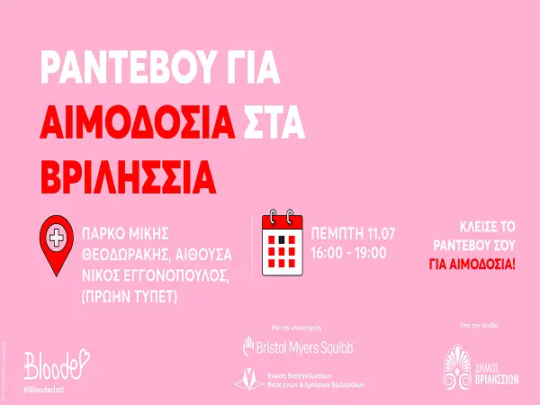 Οι ανάγκες όμως για τους ασθενείς παραμένουν υψηλές και κρίσιμες και οι ελλείψεις που εμφανίζονται εντείνουν την αγωνία τους. Με γνώμονα την ισχυρή θέληση για την ενίσχυση της επάρκειας αίματος πριν τις καλοκαιρινές διακοπές, η μη κερδοσκοπική πρωτοβουλία Bloode διοργανώνει απογευματινή εθελοντική αιμοδοσία στις 11 Ιουλίου, μεταξύ 16:00-19:00, στα Βριλήσσια, στο Πάρκο Μίκης Θεοδωράκης, πρώην ΤΥΠΕΤ (Παύλου Μπακογιάννη 36), στην αίθουσα Νίκος Εγγονόπουλος. Οι μονάδες αίματος που θα συγκεντρωθούν θα αξιοποιηθούν για τους ασθενείς του Αντικαρκινικού Νοσοκομείου Αθηνών «Άγιος Σάββας».