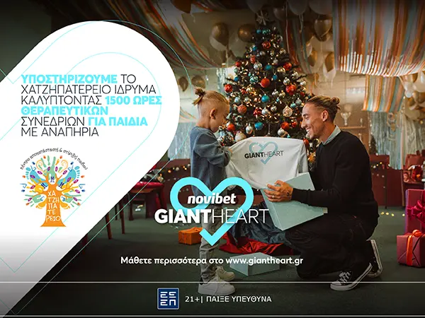 Η Novibet, η κορυφαία GameTech εταιρεία 100% ελληνικών συμφερόντων, μέσω του προγράμματος εταιρικής κοινωνικής προσφοράς Giant Heart υλοποιεί στοχευμένες δράσεις που βελτιώνουν έμπρακτα την καθημερινότητα πολλών συνανθρώπων μας. Σε αυτό το πλαίσιο, φέτος τα Χριστούγεννα, το Giant Heart της Novibet υποστηρίζει το «Χατζηπατέρειο» Κέντρο Αποκατάστασης & Στήριξης Παιδιού, το οποίο από το 1973 προσφέρει εξειδικευμένες υπηρεσίες για τη σωματική, ψυχική και κοινωνική αποκατάσταση παιδιών με αναπηρία.