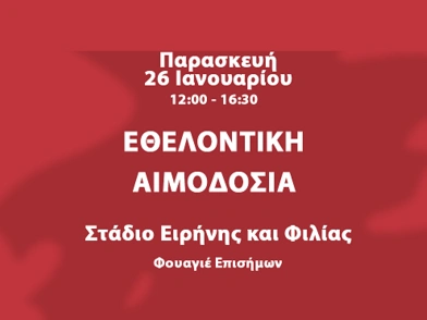 Δίνουμε ραντεβού λοιπόν στο Στάδιο Ειρήνης και Φιλίας (φουαγιέ επισήμων) την Παρασκευή 26 Ιανουαρίου 12.00-16.30 για να κάνουμε με την προσφορά μας λίγο καλύτερη τη ζωή των ανθρώπων που νοσηλεύονται τα νοσοκομεία της χώρας.