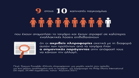 03.11.21 14:11Έρευνα: Ελλιπής πληροφόρηση - Μια μεγάλη απειλή στην πρόοδο για ένα μέλλον απαλλαγμένο από το τσιγάρο Έξι στους δέκα καπνιστές στην Ελλάδα λένε πως θα ήταν πιο πιθανό να στραφούν σε μια καλύτερη...