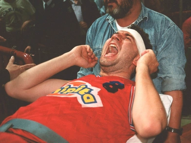 Ο Μπόμπαν Γιάνκοβιτς, μη αντέχοντας την αποβολή με 5 φάουλ, χτυπάει το κεφάλι του στη βάση της μπασκέτας και σωριάζεται στο έδαφος.