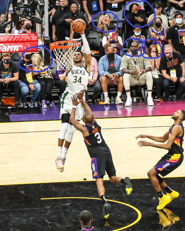 Στο χαρακτηριστικό στιγμιότυπο, φαίνονται οι οπαδοί των Σανς να γυρνούν αλλού το κεφάλι, ενώ ο ΛεΜπρόν Τζέιμς, που ήταν στο γήπεδο για να δει το ματς και να υποστηρίξει τον φίλο του Κρις Πολ, έχει πάρει μια έκφραση «όχι πάλι αυτός...» όταν ο Greek Freak πετάει πάνω από τον Πολ για να καρφώσει.