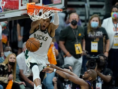 Ο Greek Freak είναι ο άνθρωπος των τελικών μέχρι στιγμής για τα «Ελάφια», καθώς στο προηγούμενο ματς έσβησε τα φώτα στον Εϊτον και χάρισε τη νίκη στην ομάδα του που ισοφάρισε σε 2-2 και τα ξημερώματα υποδέχθηκε την ασίστ του Τζρου Χόλιντεϊ, ο οποίος έπαιξε σπουδαία άμυνα, έκλεψε τη μπάλα από τον αντίπαλό του κι έτρεξε το γήπεδο για να πασάρει στον Αντετοκούνμπο που ανάγκασε το Footprint Center να σιγήσει και να κλείσει τα μάτια όταν ξεκίνησε την πτήση του.