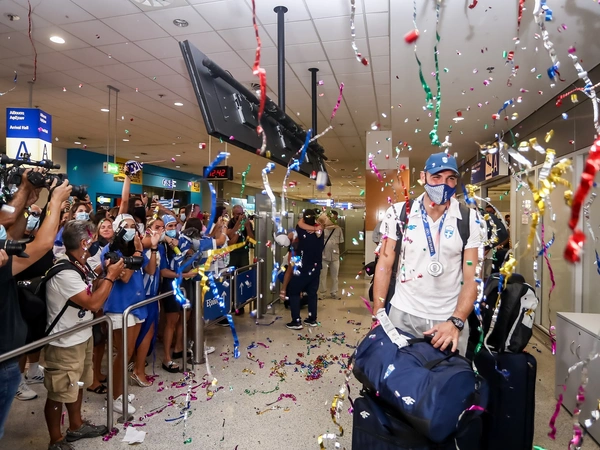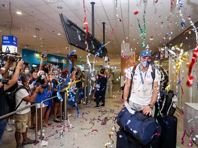 Θερμής υποδοχής έτυχαν οι παίκτες της Εθνικής Πόλο που πάτησαν λίγο πριν τις 12:30 το μεσημέρι στην Αθήνα, επιστρέφοντας από το Τόκιο, όπου και κατέκτησαν το αργυρό μετάλλιο στους Ολυμπιακούς Αγώνες, μετά από εκπληκτική πορεία.