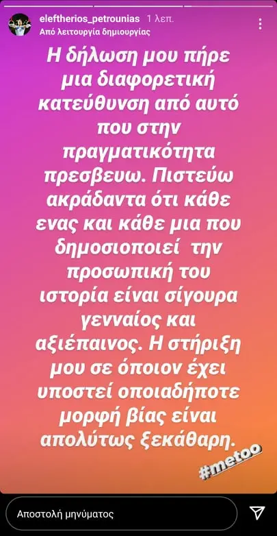 «Είμαι υπέρμαχος του κινήματος #MeToo. Στηρίζω όποιον έχει υποστεί βία. Ζητώ ξανά συγγνώμη και έχουν απόλυτο δίκιο να με κατηγορήσουν. Καταδικάζω όμως κάθε μορφή βίας», πρόσθεσε στη συνέχεια ο αθλητής. «Εγώ το ζήτησα να βγω να ζητήσω συγγνώμη γιατί όντως έκανα ένα λάθος. Ως άνθρωπος δεν είμαι τόσο ικανός όσο στους κρίκους για να εκφράσω σωστά τη σκέψη μου», συμπλήρωσε μεταξύ άλλων ο Λευτέρης Πετρούνιας.