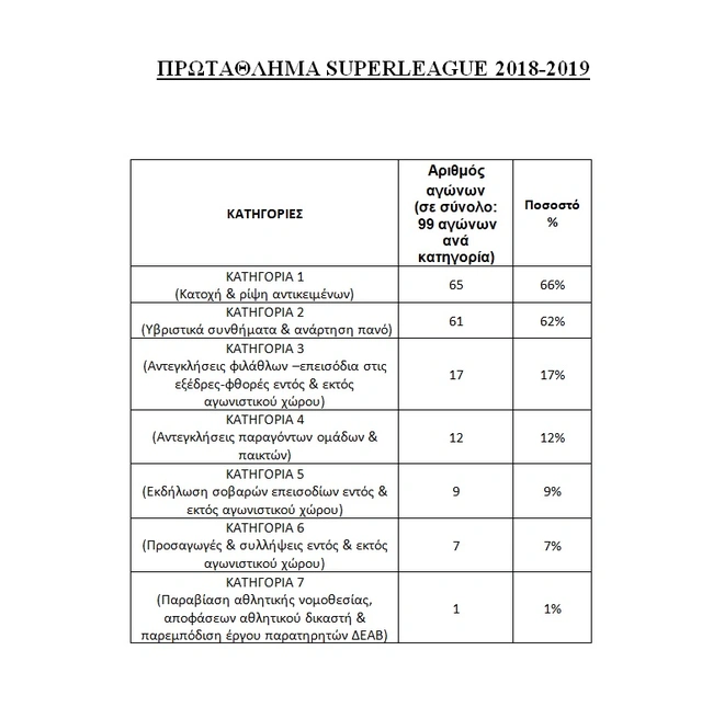 Ειδικότερα, στο πρωτάθλημα Super League της αγωνιστικής περιόδου 2018-2019 σε σύνολο 99 αγώνων με εκθέσεις παρατηρητών της Διαρκούς Επιτροπής Αντιμετώπισης της Βίας, οι 65 αγώνες (66%) αφορούν σε συμβάντα κατοχής και ρίψης αντικειμένων, σε 61 αγώνες (62%) καταγράφηκαν υβριστικά συνθήματα και ανάρτηση πανό, σε 17 αγώνες σημειώθηκαν αντεγκλήσεις φιλάθλων – επεισόδια στις εξέδρες - φθορές εντός και εκτός αγωνιστικού χώρου ενώ σε 12 αγώνες υπήρξαν αντεγκλήσεις παραγόντων ομάδων και παικτών). Σοβαρά επεισόδια είχαμε σε 9 ποδοσφαιρικούς αγώνες ενώ η Ελληνική Αστυνομία προχώρησε σε προσαγωγές και συλλήψεις σε 7 αναμετρήσεις.