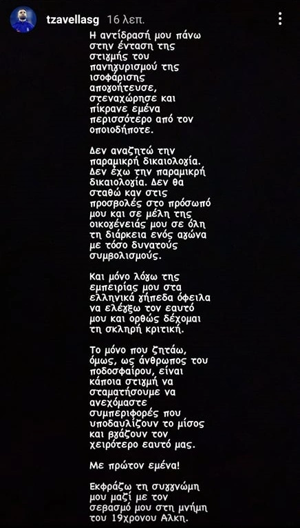 Στη σχετική ανάρτηση που έκανε στον λογαριασμό του στο instagram, ο Τζαβέλλας αναφέρει ότι δεν έχει καμία δικαιολογία και ανεξάρτητα από τις προσβολές για τον ίδιο και την οικογένειά του, θα έπρεπε να έχει συγκρατήσει τα νεύρα του στο ματς με τον Αρη. Ετσι, η συγγνώμη προς τους οπαδούς της ομάδας και του αδικοχαμένου Αλκη, δείχνει ότι ο διεθνής αμυντικός, μετάνιωσε για την αντίδρασή του την ώρα του αγώνα: