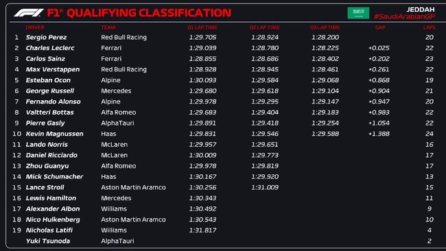 Red Bull και Ferrari μοιράζονται τις δύο πρώτες σειρές του grid, με τον Σαρλ Λεκλέρ της Scuderia να ηττάται για μόλις 25 χιλιοστά του δευτερολέπτου! Κάρλος Σάινθ και Μαξ Φερστάπεν θα παραταχθούν στη δεύτερη σειρά της εκκίνησης ενός αγώνα που αναμένεται συναρπαστικός! Πίσω τους θα είναι η Alpine του Έστεμπαν Όκον και η Mercedes του Τζορτζ Ράσελ.