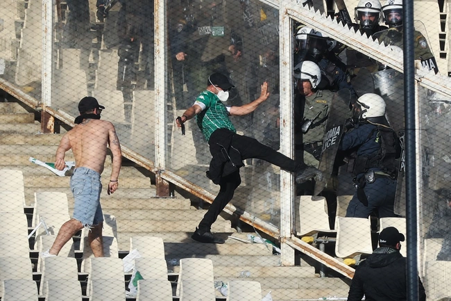 Αξίζει να σημειωθεί πως οι αρκετοί φίλοι των πράσινων έχουν φύγει από τις θέσεις τους στην κερκίδα και έχουν βγει έξω λόγω της χρήσης δακρυγόνων, αφού η ατμόσφαιρα είναι αποπνικτική. Οι οπαδοί του Παναθηναϊκού παίζουν εδώ και αρκετά λεπτά ξύλο με την αστυνομία που κάνει μεγάλη προσπάθεια να μην περάσουν στην κενή ζώνη του ΟΑΚΑ.