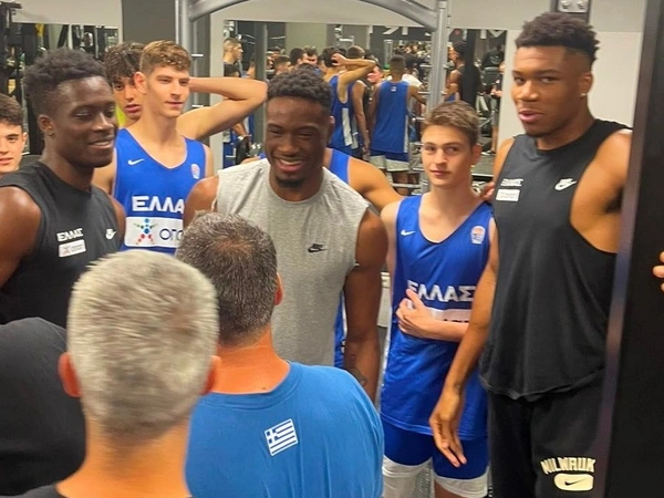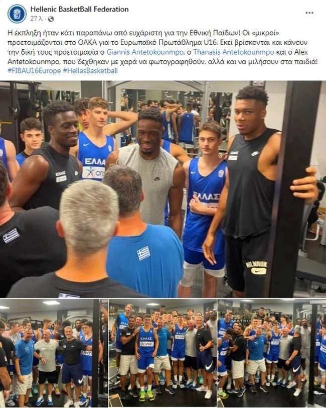 «Η έκπληξη ήταν κάτι παραπάνω από ευχάριστη για την Εθνική Παίδων! Οι «μικροί» προετοιμάζονται στο ΟΑΚΑ για το Ευρωπαϊκό Πρωτάθλημα U16. Εκεί βρίσκονται και κάνουν την δική τους προετοιμασία ο Γιάννης Αντετοκούνμπο, ο Θανάσης Αντετοκούνμπο και ο Αλεξ Αντετοκούνμπο, που δέχθηκαν με χαρά να φωτογραφηθούν, αλλά και να μιλήσουν στα παιδιά», ανέφερε από την πλευρά της, σε σχετική ανάρτηση, η ΕΟΚ.