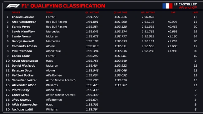 Την έβδομη φετινή του pole position κατέκτησε ο Σαρλ Λεκλέρ, σημειώνοντας τον καλύτερο χρόνο (1:30.872) στο Q3 του Grand Prix Γαλλίας. Ο Μονεγάσκος οδηγός της Scuderia Ferrari ευχαρίστησε και δημοσίως τον teammate του, Κάρλος Σάινθ, ο οποίος του έδωσε «αεροδυναμική βοήθεια» (το λεγόμενο tow) στην πίσω ευθεία της πίστας. Ο Ισπανός έχει λάβει ποινή για αλλαγή της μονάδας ισχύος στο μονοθέσιό του και άρα δεν θα μπορούσε να διεκδικήσει μία από τις πρώτες θέσεις στο grid.