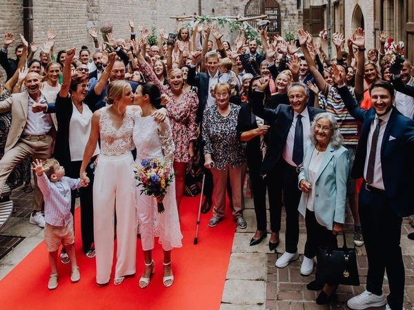 Η 34χρονη Ιταλίδα και η 32χρονη Βελγίδα είναι ομόφυλο ζευγάρι εδώ και περίπου 8 χρόνια και είχαν παντρευτεί με πολιτικό γάμο στην Ιταλία αλλά αποφάσισαν πως ήθελαν να ζήσουν και την τελετή εκτός δημαρχείου. Έτσι φόρεσαν και οι δύο τους νυφικά και ενώθηκαν μπροστά σε συγγενείς και φίλους.