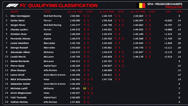 Οι ποινές που έχουν δεχτεί αρκετοί οδηγοί για αλλαγή κινητήρων και άλλων μηχανικών μερών πέρα από το επιτρεπόμενο, ανακάτεψε την τράπουλα στις κατατακτήριες δοκιμές του Grand Prix Βελγίου. Στην πίστα του Σπα ο Μαξ Φερστάπεν σημείωσε τον καλύτερο χρόνο (1:43.665) και στατιστικά ήταν αυτός που πήρε την pole position.