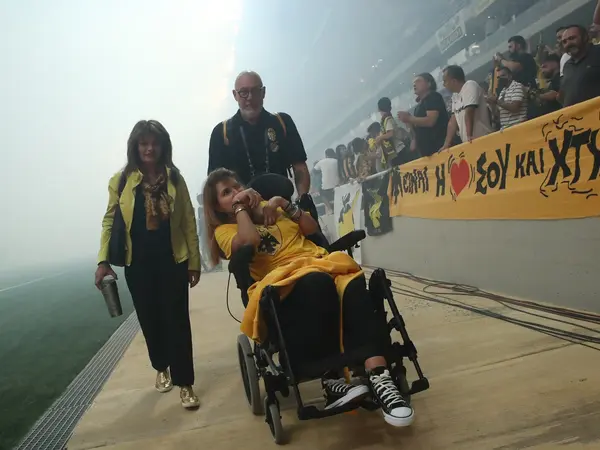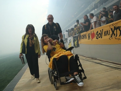 Στον αγωνιστικό χώρο του νέου γηπέδου της ΑΕΚ βρέθηκε πριν την έναρξη του αγώνα με τον Ιωνικό η 23χρονη Μυρτώ, γνωστή φίλη της Ενωσης που πριν από χρόνια έζησε μια δραματική περιπέτεια που άλλαξε τη ζωή της και την καθήλωσε σε αναπηρικό καροτσάκι. Αναμφίβολα, ήταν μια ξεχωριστή παρουσία στην πρεμιέρα της ΑΕΚ στην Opap Arena. Η Μυρτώ είναι το κορίτσι που το καλοκαίρι του 2012 είχε συγκλονίσει το πανελλήνιο, όταν δέχτηκε επίθεση ξυλοδαρμού και βιασμού από αλλοδαπό σε παραλία της Πάρου. Σήμερα δεν μπορούσε να λείπει από την επιστροφή της αγαπημένης της ποδοσφαιρικής ομάδας στην φυσική της έδρα.