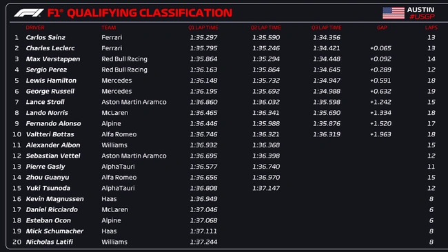 Την τρίτη pole position, φέτος αλλά και συνολικά στην καριέρα του στη Formula 1, σημείωσε στο Circuit of the Americas ο Κάρλος Σάινθ. Ο 28χρονος Ισπανός οδηγός της Scuderia Ferrari σημείωσε καλύτερο χρόνο από τους Σαρλ Λεκλέρ και Μαξ Φερστάπεν στην τρίτη περίοδο των κατατακτήριων δοκιμών και θα εκκινήσει την Κυριακή από την 1η θέση του grid. Οι κατατακτήριες δοκιμές στο Όστιν των ΗΠΑ επισκιάστηκαν από την είδηση του θανάτου του Ντρίτριχ Μάτεσιτς, ιδρυτή και ιδιοκτήτη της Red Bull.