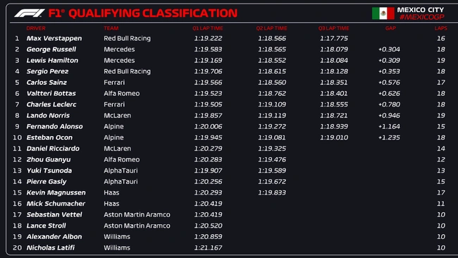 Την έκτη φετινή του pole position στη Formula 1 πανηγύρισε ο Μαξ Φερστάπεν. Ο Ολλανδός δεν άφησε περιθώρια αμφισβήτησης κατά την τρίτη περίοδο των κατατακτήριων δοκιμών στο Autodromo Hermanos Rodriguez, στην Πόλη του Μεξικού. Ο καλύτερος γύρος του παγκόσμιου πρωταθλητή της Red Bull Racing χρονομετρήθηκε στο 1:17.775 και ήταν κατά 3 δέκατα ταχύτερος από τους δύο οδηγούς της Mercedes-AMG, Τζορτζ Ράσελ και Λιούις Χάμιλτον.