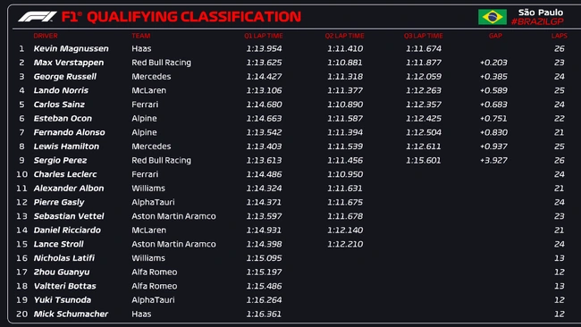 Στο grid του αγώνα σπριντ (εκκίνηση στις 9.30 μμ το Σάββατο, ώρα Ελλάδας), δίπλα στον Μάγκνουσεν θα βρεθεί ο Μαξ Φερστάπεν, ενώ στη δεύτερη σειρά οι Ράσελ και Λάντο Νόρις.