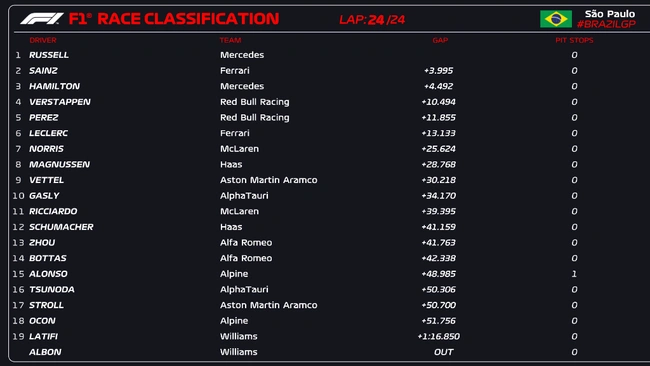 Εκμεταλλευόμενος την ταχύτητα που του προσέφερε το σετ ελαστικών μαλακής γόμας στο μονοθέσιό του, ο Τζορτζ Ράσελ έφθασε σε μία δίκαιη νίκη στον αγώνα σπριντ της Formula 1, στο Ιντερλάγκος της Βραζιλίας. Ο 24χρονος Βρετανός της Mercedes-AMG κατάφερε να περάσει τον Μαξ Φερστάπεν στον 15ο από τους 24 γύρους του αγώνα και στη συνέχεια είχε ένα εύκολο έργο.