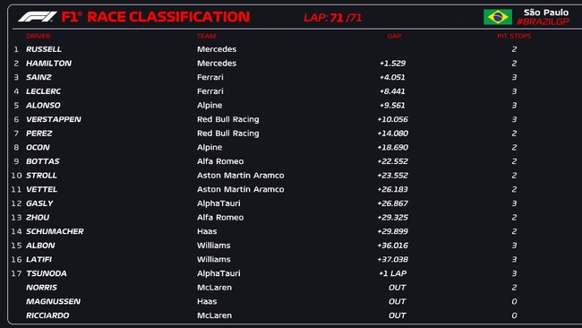 Μαζί με τον Ράσελ ανέβηκαν στο βάθρο ο Λιούις Χάμιλτον (παρά τη σύγκρουση με τον Μαξ Φερστάπεν νωρίς στον αγώνα που του στοίχισε αρκετό χρόνο) και ο Κάρλος Σάινθ της Scuderia Ferrari. Ακολούθησαν οι Σαρλ Λεκλέρ (Ferrari), Φερνάντο Αλόνσο (Alpine) και Μαξ Φερστάπεν.