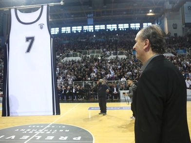 Με σεμνή διαδικασία, στο κατάμεστο PAOK Sports Arena, πριν από το τζάμπολ της αναμέτρησης για την 21η αγωνιστική της Basket League, ανάμεσα στον ΠΑΟΚ και την ΑΕΚ, ανέβηκε σήμερα η φανέλα με το Νο7, προς τιμήν του Μπάνε Πρέλεβιτς. Η φανέλα με την οποία ο άλλοτε εμβληματικός αρχηγός του «Δικεφάλου», συνέδεσε την αθλητική του διαδρομή με τον ΠΑΟΚ.