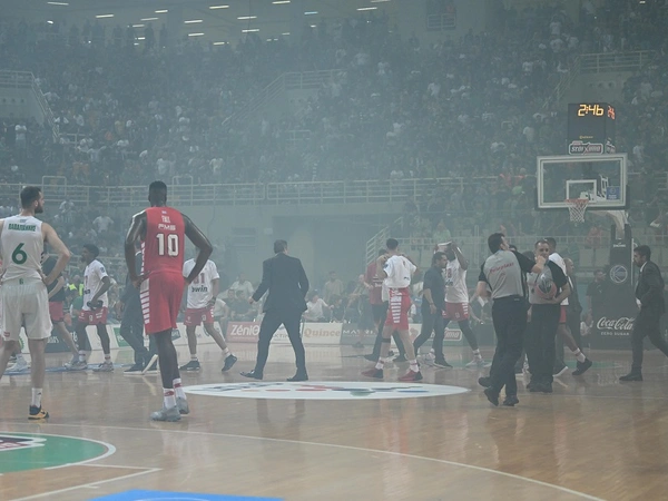 Τα καπνογόνα που άναψαν στο κλειστό των Ολυμπιακών Εγκαταστάσεων δημιούργησαν μία αποπνικτική ατμόσφαιρα, με τους «ερυθρόλευκους» να αποχωρούν για τα αποδυτήρια μέχρι να καθαρίσει η ατμόσφαιρα.