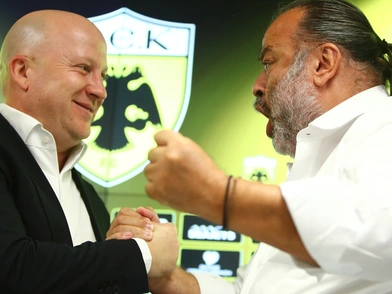 Ο Μάριος Ηλιόπουλος, ο ισχυρός άνδρας της ΑΕΚ, μίλησε προς τον Νίκολιτς μετά το τέλος της παρουσίασης του Σέρβου τεχνικού και στη συνέχεια τον αγκάλιασε.