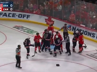 Δεν άργησε να εκραγεί το τεταμένο κλίμα μεταξύ Αμερικανών και Καναδών, παικτών και οπαδών, στο κλασικό ντέρμπι του ice hockey ΗΠΑ - Καναδάς, όταν τα μέλη των ομάδων ήρθαν στα χέρια.