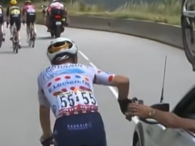 Στο βίντεο φαίνεται να τον πλευρίζει το αυτοκίνητο της ομάδας του και ο οδηγός να απλώνει το χέρι του για να του δώσει παγούρι με ισοτονικό για να αναζωγονηθεί.