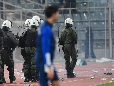 «Αργότερα, μεγαλύτερη ομάδα ατόμων, έξω από το γήπεδο, κινήθηκε απειλητικά κατά αστυνομικών, εκσφενδονίζοντας αντικείμενα (πέτρες και φωτοβολίδες ευθείας βολής), με αποτέλεσμα να απειληθεί η σωματική ακεραιότητα των οργάνων της τάξης και να προκληθούν ζημιές σε υπηρεσιακό λεωφορείο της ΕΛΑΣ», υπογράμμισε η Ελληνική Αστυνομία.