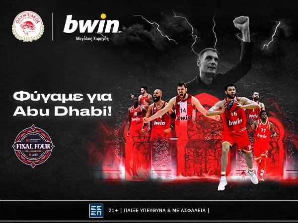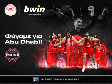 Η bwin, Μεγάλος Χορηγός της ΚΑΕ Ολυμπιακός, συγχαίρει θερμά τους «ερυθρόλευκους» για την πρόκριση στο Final Four της EuroLeague, εύχεται καλή επιτυχία και δίνει ραντεβού με την ομάδα στο Άμπου Ντάμπι. Πάντα δίπλα, πάντα στο πλευρό του θρύλου.
