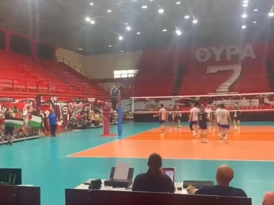 Διαδηλωτές από την March to Gaza Greece διέκοψαν στο κλειστό γυμναστήριο «Μελίνα Μερκούρη» στον Ρέντη, τον φιλικό αγώνα ανδρικού βόλεϊ μεταξύ των εθνικών ομάδων Ελλάδας και Ισραήλ.