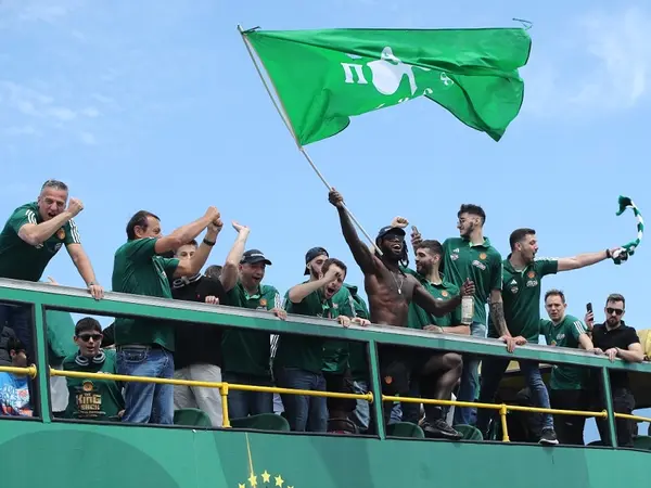 Ο σέντερ του τριφυλλιού είναι γυμνός πάνω στο ανοιχτό πούλμαν που μεταφέρει την ομάδα προς το ΟΑΚΑ και πανηγυρίζει έξαλλα μαζί με τους οπαδούς.