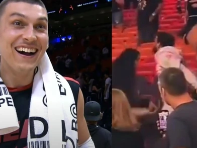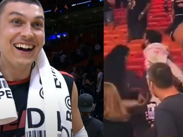 Ο γκαρντ των Χιτ μιλούσε για το παιχνίδι στην δημοσιογράφο όταν την προσοχή του τράβηξε ένας καβγάς στις κερκίδες.