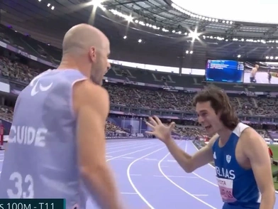 Σε πανηγυρισμούς ξέσπασαν ο Νάσος Γκαβέλας και ο Γιάννης Νυφαντόπουλος όταν συνειδητοποίησαν ότι κατέκτησαν το χρυσό μετάλλιο στα 100 μ. Τ11 στους Παραολυμπιακούς Αγώνες στο Παρίσι.