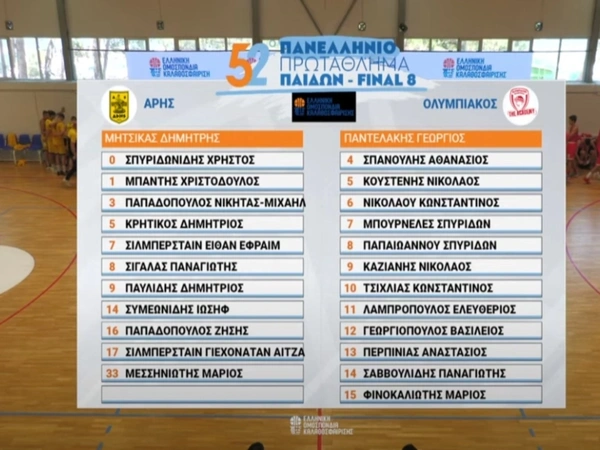 Δείτε την αναμέτρηση ανάμεσα στον Άρη και τον Ολυμπιακό για τον τελικό του Πανελληνίου Πρωταθλήματος Παίδων.