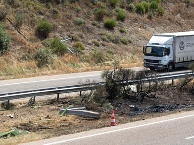 Στα πλάνα φαίνονται κομμάτια από το κατεστραμμένο αυτοκίνητο στο πλάι του δρόμου ενώ μεγάλο μέρος του έχει γίνει μία άμορφη μάζα, καθώς έχει καεί σχεδόν ολοσχερώς.