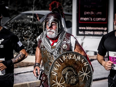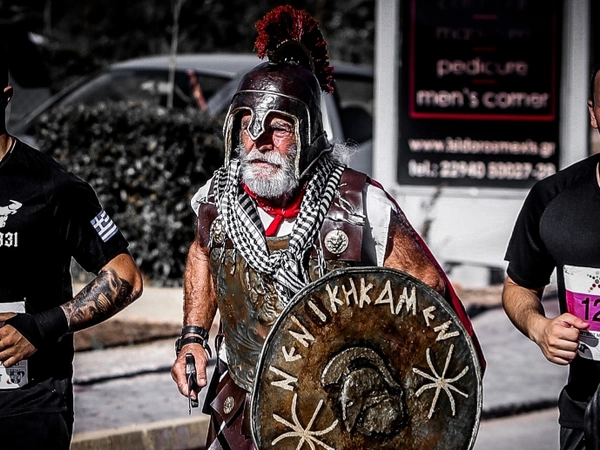 Ο δρομέας συμμετείχε στον Μαραθώνιο φορώντας πλήρη στρατιωτική περιβολή και κρατώντας μέχρι και ασπίδα.