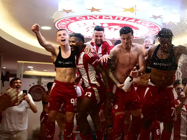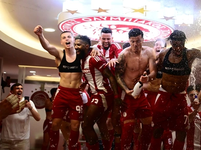 Το πάρτι ξεκίνησε από τον αγωνιστικό χώρο του «Γεώργιος Καραϊσκάκης» και συνεχίστηκε στα αποδυτήρια για τους παίκτες της ομάδας.