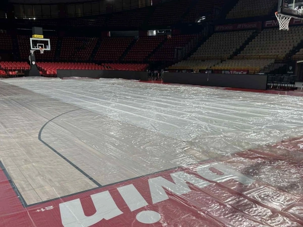 Με την οροφή να χρειάζεται ακόμη αλλαγή και να «μπάζει» νερά σε κάθε βροχόπτωση, οι άνθρωποι του ΣΕΦ άπλωσαν έναν μουσαμά στο παρκέ, προκειμένου να προστατέψουν το ξύλο, ώστε να μην φουσκώσει, όπως είχε συμβεί στο παρελθόν.