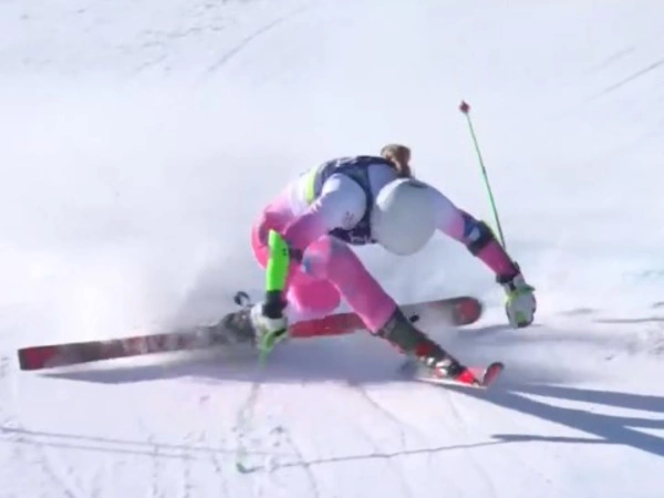 Η 41χρονη αθλήτρια ξεκινά να κατεβαίνει την ολυμπιακή πίστα και λίγο πριν τον τερματισμό χάνει τον έλεγχο και πέφτει.